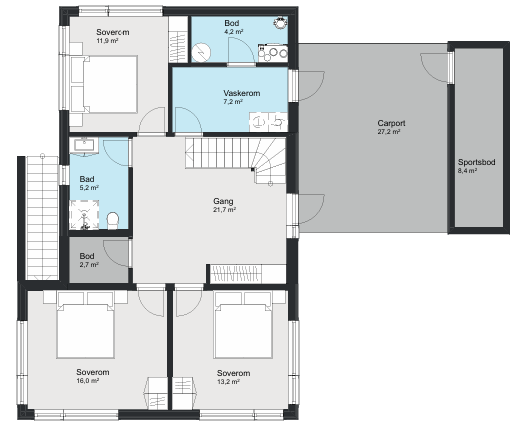 Huset har integrert carport og sportsbod som gir god lagringsplass. Den åpne stue- og kjøkkenløsningen med direkte utgang til altanen er hjemmets samlingspunkt. Boligen har fire romslige soverom og tilhørende fasiliteter som gjør det til den komplette familieboligen.