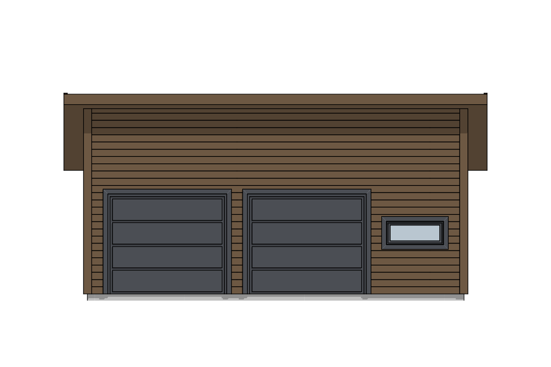 Bygget har en moderne fasade og står svært godt sammen med moderne boliger. Garasjen har moderne, smale vinduer som opprettholder et tidsriktig ytre samtidig som de slipper lys inn i garasjerommet. En dør er plassert på nordveggen, for at du enkelt kan gå inn og ut av garasjen uten å måtte åpne portene.